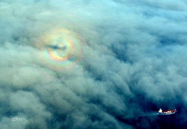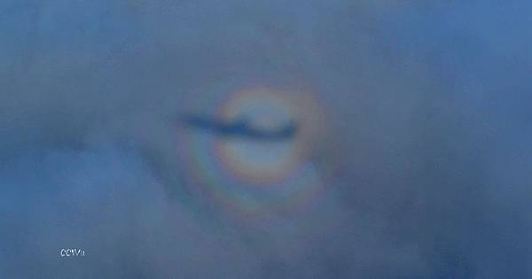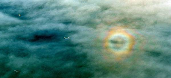 飛機起飛,一開始在迷霧中飛行,讓我想起最近NBA的大事件,就是KOBE的意外,據說直升機在濃霧中飛行,那我再想一班的客機在雲朵裡面飛行應該沒有問題,因為有很多先進的設備,就算前方看不到,憑著儀器也能讓旅客平安。當飛機衝出雲霧時,發現雲朵上有彩虹圓圈,這不是飛機的影子嗎? 我們在爬山的時候會說這種情況叫做觀音圈,原來這是光環(Glory)是一種陽光透過雲霧反射,並經由雲霧中的水滴發生繞射與干涉,最後形成一圈彩虹光環的光學現象,在光環中經常包括觀察者本身的陰影。