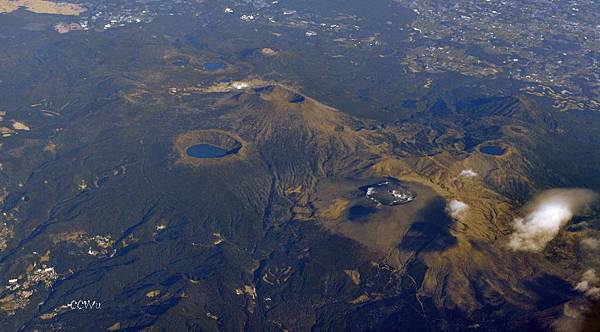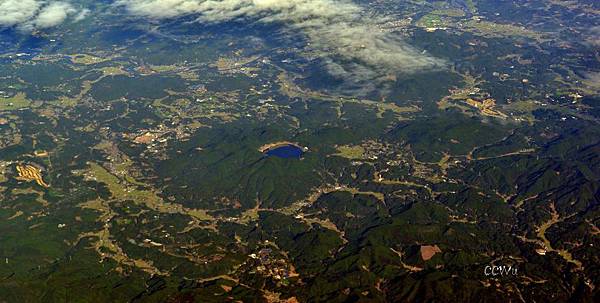 接下來進入到我夢寐以求想看到的韓國岳,即霧島錦江灣國立公園,可以看到遠處的六觀音御池、不動池、大浪池、韓國岳、新燃岳等等,然後盤算著我要怎麼到這些地方,從空中來規劃行程感覺還蠻棒的,還有看到曾經去過的霧島溫泉鄉,差一點點就可以到大浪池了。飛機沒有穿越鹿兒島市,而是沿著西邊飛行,所以先經過藺牟田池県立自然公園的上方,這裡也是一個火山所形成的火山口湖,只不過沒有那麼明顯的錐狀。平均水深約3.5公尺,是一個著名的濕地公園,其中一個特色就是「浮島」,乍看像是浮在水池上的小島,其實是植物枯萎之後不腐爛堆積在水池裡,像是島嶼,也被指定為國家天然紀念物。真的是坐飛機長知識。