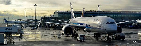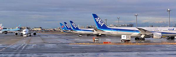 登機的時候,外面還下著小雨,窗外都是雨滴,突然間,雨就不下了,當飛機緩慢地移動,離開航廈,沿著既定的路線慢慢前進,看到停在停機坪的飛機,其實也是很忙碌的。看到下一趟旅程要搭的ANA飛機,又開始充滿期待。