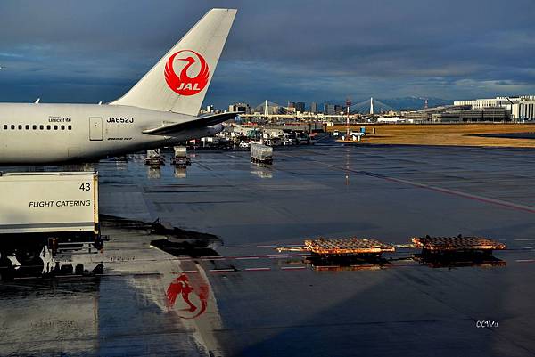 當飛機離開航廈,準備起飛時,陽光從陰鬱的雲層透了出來,機場跑道上開始有一些倒影,遠方秩父一帶的山頭可以看到積雪,但仍看不到富士山。