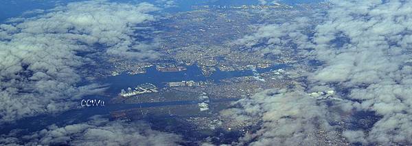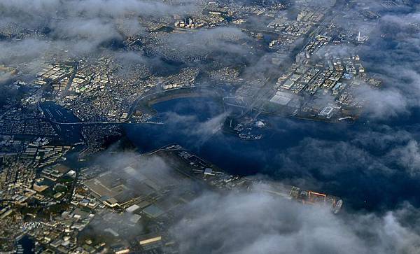 天際的邊緣,依然被厚厚的雲層遮蔽,但至少比前兩天好太多,沒多久飛機就起飛,沿著陸地的邊緣,盤旋在空間,我往窗外看,這不是橫濱的八景島嗎? 上面有一個菱形屋頂的特殊建築物。