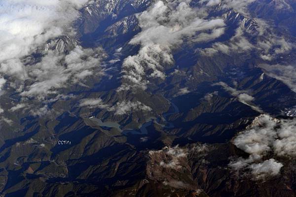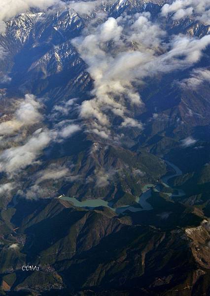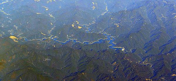穿過富士山之後,就到靜岡縣了,富士山剛好坐落在靜岡、山梨以及神奈川之間。靜岡縣本身也有一半的區域是山脈。其中著名的日本南阿爾卑斯山系有一部分就在靜岡縣。當飛機到這個上空,看到有積雪的山頭,那應該就是。當我往向窗外,看到奧大井川,仔細一看,還會看到接岨湖上面的紅色彩虹橋。寸又峽就在接岨湖的左側,這一帶是秋天賞楓名所,一直很希望有機會可以過來,光是從空中俯瞰也是很過癮。