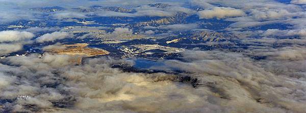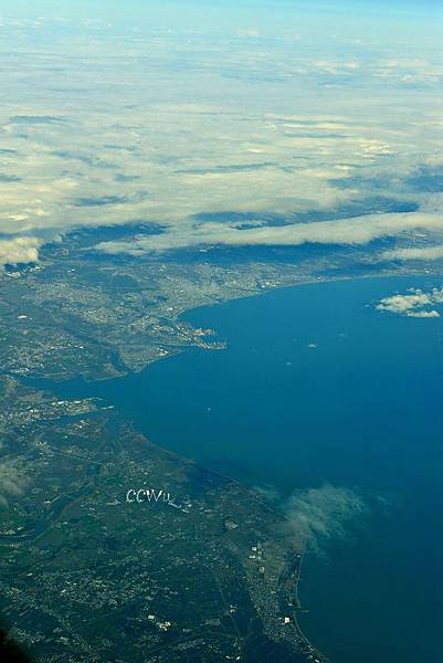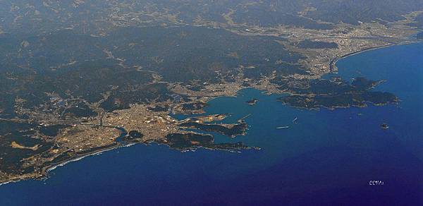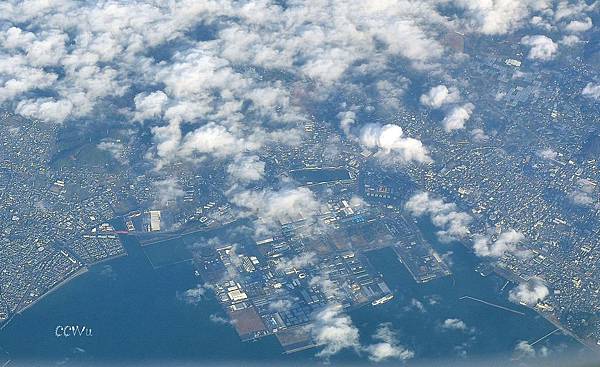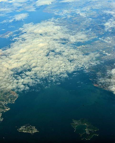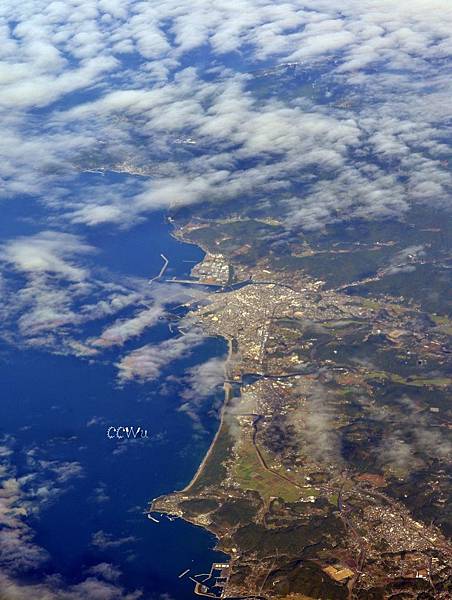 過了大井川鐵道之後,又是厚厚的雲層,但依稀可以知道要接近名古屋,愛知縣也是一個工業還算發達的區域,往下看就是位於愛知縣三河灣的蒲郡市,接下來看到半田市及碧南市相交的的河川,碧南火力發電廠也可以看到。再來就是三河灣的佐久島,去年去名古屋時,看知多半島的旅遊資訊,就有提到佐久島。