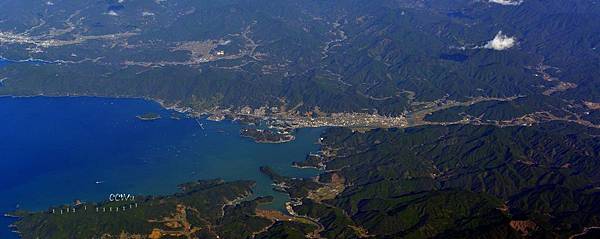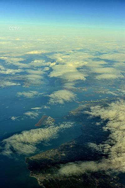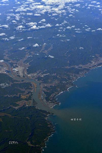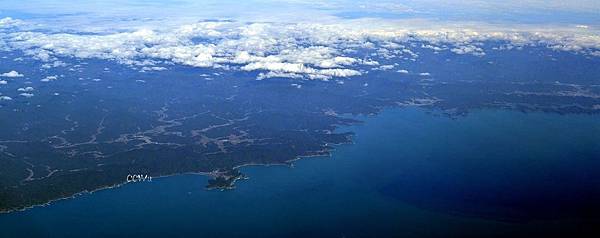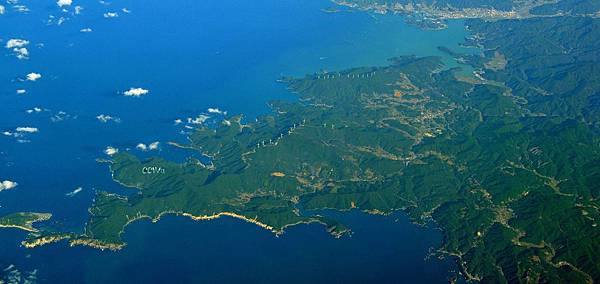 過了名古屋之後,就甚麼都看不到,我想京都跟大阪這時候都被厚厚的雲層蓋住,安心的吃飛機上早餐,接下來就沿著四國南邊的海岸線飛行,我沒有去過四國,其實最近也沒有計畫要安排四國的旅行,很多地方都不認識,只拍了四國南部的興津,是突出於海岸線的一個小半島,從空中往下看很明顯。另外是拍四万十川的出海口,四万十川號稱日本的最後清流,不過出海口黃濁的顏色,有點像是九份外的陰陽海。最後來到四國的邊緣,大月町的大月半島,從高空中吸引我的是看到一列列風力發電,最近台灣的風力發電如火如荼的展開。這裡有一個大堂山展望,可以遠眺半島跟海洋。從空中往下看一個特點就是半島的尾端還有一個小島,叫做柏島,聽說這邊也是秘境,海水清澈如鏡,小船彷彿是漂浮在透明的海域上。原來這裡也是足摺宇和海國立工園的一部份。有人媲美這裡是義大利南部的Isola di Lampedusa(蘭佩杜薩島,感覺會有很多北非的非法移民,畢竟這裡離非洲比較近)。柏島是一個陸繫島,為太平洋水域及九州豐後海峽水域交會,生物量也是很驚人的區域。沒想到我拍到一個不得了的地方。