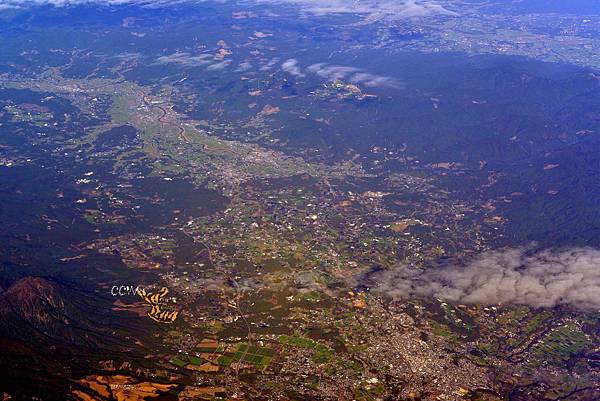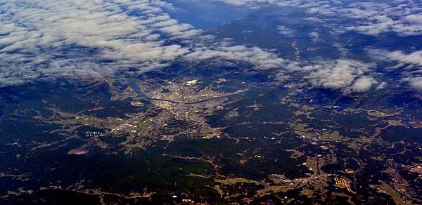 飛機離開四國之後,跨越豐後海峽,令我訝異的是九州跟四國超近的,高速船可能一個小時就可以抵達。九州上空沒有烏雲密佈,28日才下過超大的雨。飛機從日向市南端進入,看起來日向也算是腹地蠻大的城市,然後要跨越南九州,從鹿兒島端出海。日向市附近有一個還蠻大的水庫,一ッ瀬ダム,從空中看跟大井川鐵道的還蠻像的。接下來進入到小林市的上空,狹長的谷地,生活機能應該很好。