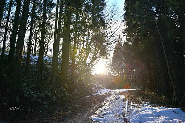 離開旅館之後,路上都沒什麼人,又沒有雪,感覺很蕭條,大概要步行2.5公里,就可以到潟沼,感覺沒有很遠。山路是蜿蜒的,但步行也許會有捷徑,從Googlemap看是一個大U的路,前方剛好有一條步行的捷徑,沒想太多就沿著石板路走,但沒想到最後沒路,然後又陷入爛泥巴之中,但最後還是穿出一片樹林,回到正軌的路徑。之後路的兩旁就有積雪,翻過山頭,就可以到潟沼。途中有些地方路面積冰,所以走起來很緩慢,因為會滑倒。