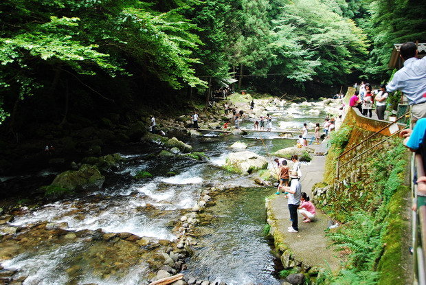 瀑布下的本谷川成了親子嬉戲的釣魚場所,