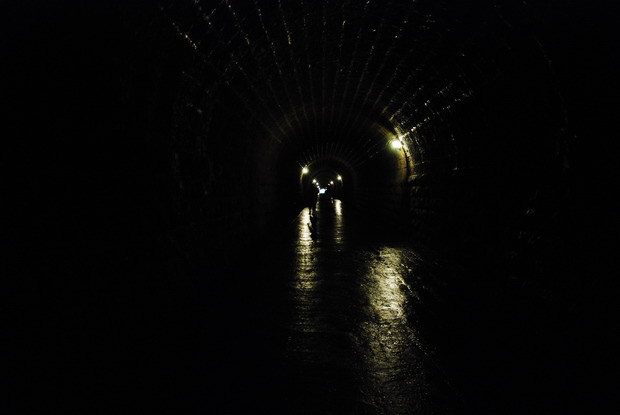 隧道內部陰暗,一排排的黃熾燈更添增些許詭異的氣氛。